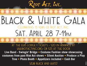 Jackson, WY – Riot Act will be celebrating our 15th anniversary season with a Black & White Gala on Saturday, April 28 at The Elks Lodge from 7:00pm-11pm.