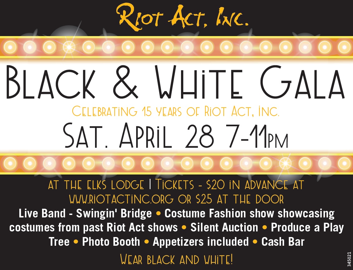 Fun to be had by all. We encourage guests to dress in Black & White. There will be a live band all night – Swingin’ Bridge. Enjoy included appetizers. Reminisce about past Riot Act performances with our Costume Fashion show featuring costumes from past productions worn by the original actors. There will be a silent auction with great prizes. Help us with our Produce a Play Giving Tree. And bring home a souvenir from our photo booth.
